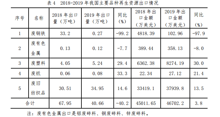 2019 年,我國廢鋼鐵、廢有色金屬、廢塑料、廢紙、廢舊紡織品五大品種再生資源出口量 40.66 萬噸,同比下降 40.2%。2018-2019年我國主要品種再生資源出口情況如表4 所示。