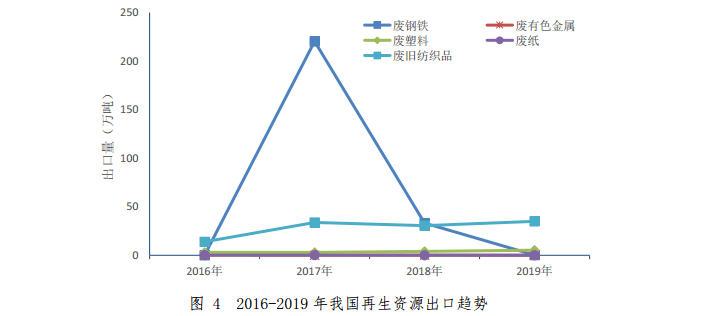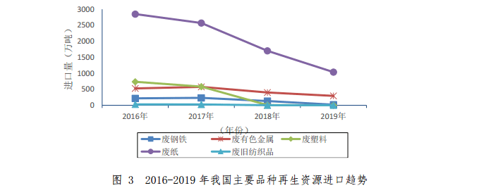 2019 年,我國廢鋼鐵、廢有色金屬、廢塑料、廢紙、廢舊紡織品五大品種再生資源進口量為 1349.42 萬噸,同比下降 39.8%。其中降幅最大的是廢塑料,同比下降98.2%。2018-2019年我國主要品種再生資源進口情況如表3所示。2016-2019 年我國再生資源進口趨勢如圖 3 所示。