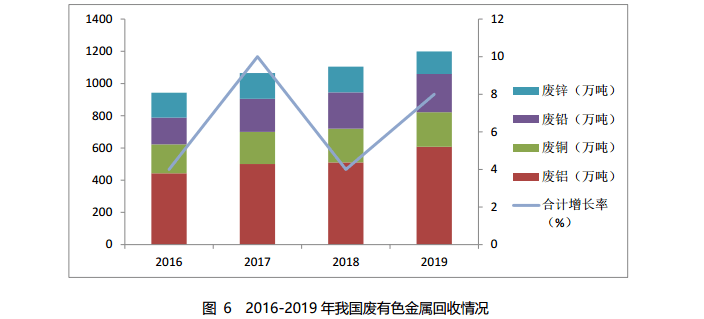 據初步估算,2019年銅、鋁、鉛、鋅等4種再生有色金屬產量約1437萬噸,同比增長1.9%。其中再生銅產量約330萬噸,同比增長1.5%;再生鋁產量約725萬噸,同比增長4.3%;再生鉛產量約237萬噸,同比增長5.3%;再生鋅產量約145萬噸,同比下降12.1%。