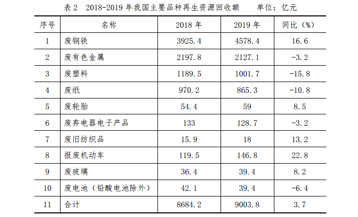 2019年,我國十大品種再生資源回收總額約9003.8億元,同比增長3.7%。報廢機動車、廢鋼鐵、廢舊紡織品、廢輪胎、廢玻璃等品種的回收額均有增長,其中報廢機動車回收額增幅最高,同比增長22.8%。2018-2019年我國主要品種再生資源回收額如表2所示。
