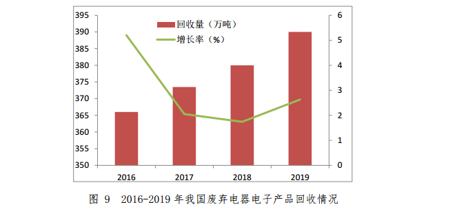 截至 2019 年底,全國共有 29 個省(區、市)的 109 家廢棄電器電子產品拆解處理企業納入廢棄電器電子產品處理基金補貼企業名單,電視機、微型計算機、洗衣機、電冰箱和空氣調節器的回收量約 17100 萬臺,報廢重量超過390萬噸。2016-2019 年我國廢棄電器電子產品回收情況如圖9所示。