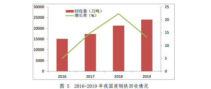 2019年,我國粗鋼和鋼材產量分別為9.96億噸和12.05億噸,同比增長8.3%和9.8%,粗鋼產量再創歷史新高;回收廢鋼鐵約24097萬噸1,同比增長13.3%。其中,重點大型鋼鐵企業回收廢鋼鐵約21597萬噸,同比增長15.0%;其他企業回收廢鋼鐵約2500萬噸,與2018年持平;廢鋼單耗為216.7kg/t 鋼,同比增加14.4kg/t鋼,增幅為7.1%,綜合廢鋼比21.67%, 同比增加1.49個百分點。2016-2019年我國廢鋼鐵回收情況如圖5所示。