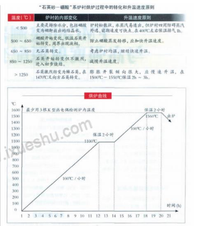 烘爐與燒結(jié)爐襯是獲得優(yōu)良高溫強度的一個重要環(huán)節(jié)。燒結(jié)工藝是根據(jù)石英砂的多晶轉(zhuǎn)化特性和爐子的容量決定的。必須指出的是,SiO2多晶轉(zhuǎn)變時十分緩慢的,即使烘爐燒結(jié)完成,那也是表層很薄一層,經(jīng)過加厚至10mm~30mm,這與爐溫有關(guān)。靠緊感應器為松散層,靠鐵水為燒結(jié)層,中間為過渡層。這一結(jié)構(gòu)特性能防止透燒開裂,能保持爐襯整體性和可靠性,對不斷促使爐襯致密化是十分有益的,這是其他一般耐火材料所不具備的優(yōu)點。烘爐燒結(jié)的要領(lǐng)是:低溫緩慢升溫,高溫滿爐燒結(jié),爐料要求低碳少銹。整個過程分三個階段進行。1.烘爐階段。坩堝鋼模到達1100℃以前,必須緩慢加熱,以便硼酸中的結(jié)晶水(約占重量43%)和爐襯材料中的水分慢慢排出爐外。此外,還因為石英在573℃、867℃和1025℃時有多晶轉(zhuǎn)變,引起體積膨脹,在此區(qū)間緩慢加熱可以使局部膨脹應力分散開、裂紋少,故升溫速度以100℃/h~140℃/h為宜,需9h~12h。2.熔化階段。當坩堝鋼模溫度達1100℃~1200℃時陸續(xù)加入小塊冷料,為減小爐溫波動過大,每次投料不宜過多,以200㎏~400㎏左右為宜,當全部融化使鐵水面上升至爐口250mm左右為止。此階段前期(未熔化)功率較高,約為60%額定功率,可使爐料迅速升溫,降低爐襯溫差。待全部熔化前,應立即降低功率減少沖刷力繼續(xù)升溫,需時約5h以上。3.燒結(jié)階段。繼續(xù)升溫至1550℃左右后保溫2h~3h,以使爐襯在高溫形成具有足夠強度的硬殼,然后傾出全部鐵水,檢查爐襯表面燒結(jié)狀況,再返回1/2爐鐵水,加料連續(xù)熔化至少2~3爐方可停爐。在此階段中,由于爐襯中仍含有水汽,防止對感應圈絕緣的影響,爐襯強度較差,減少金屬液攪拌沖刷的危害,所以送電電壓不超過80%~90%額定電壓。4.保溫、冷卻。爐子保溫或空爐冷卻時,應蓋好爐蓋,周圍封嚴,減少供水量,以便爐襯緩慢冷卻達到均勻收縮,減少裂縫。并且爐子投產(chǎn)最初前三天內(nèi),非生產(chǎn)班次爐內(nèi)應裝滿鐵水保溫,溫度控制在1300℃~1350℃。需要注意的是在進行測量時,爐溫低于500℃熱電偶要貼靠坩堝模,之后在移至爐膛中心,確保溫度測量準確性。5.烘爐曲線。需要注意的是:如采用廠家配置好的爐料,由于爐料的成分配比不盡相同,烘爐曲線要嚴格按照廠家提供的曲線進行升溫,確保爐料充分燒結(jié),提高爐襯壽命。對于中頻爐爐襯的壽命:優(yōu)質(zhì)干凈的筑爐材料、合理配比,精心打結(jié)、科學烘烤與燒結(jié)是延長壽命的基礎(chǔ);嚴格操作工藝同樣是延長爐子使用壽命的重要保障。