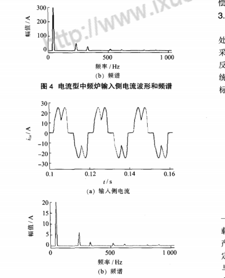 利用PSIM軟件分別建立電流型中頻爐和電壓型中頻爐的仿真模型.其結(jié)構(gòu)如圖2和圖3所示電流型中頻爐逆變側(cè)由4個晶閘管橋臂組成.電壓型中頻爐逆變側(cè)由4個IGBT組成將中頻爐加熱頻率設(shè)為1000Hz,中頻爐額定功率P為100kW.電源電壓為220V。根據(jù)所建仿真模型.得到中頻爐的輸人諧波特性:電流型中頻爐輸入側(cè)a相電網(wǎng)電流波形和頻譜如圖4所示.電壓型中頻爐輸人側(cè)a相電網(wǎng)電流波形和頻譜如圖5所示