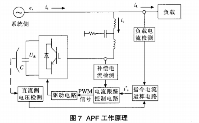 采用并聯(lián)型APF。其主電路結(jié)構(gòu)如圖6所示,出口處采用LCL濾波器連接電網(wǎng),用于濾除開關(guān)次諧波。采用一種新型的基于直流側(cè)電容電壓控制和電流閉環(huán)反饋控制的算法[,從瞬時有功和瞬時無功能量在系統(tǒng)中傳遞的角度出發(fā),以調(diào)節(jié)電網(wǎng)有功能量為主要目標來對輸入的電流進行控制。