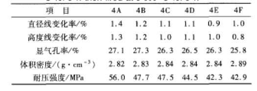 經l350oC3h預燒后的試樣4A-_4F再經1600℃3h燒后的性能檢測結果見表5。由表5可見,隨復合促燒劑加入量的減小,試樣的直徑線變化、高度線變化、耐壓強度在逐漸減小,體積密度在逐漸增加。綜合比較而言,試樣4c的強度較高,線變化比較合理,該試樣在1000以下燒后幾乎無強度,呈粉狀,1200oC燒后稍微有點強度,1350oC燒后有一定的強度,1600oC燒后有較高的燒結強度,可以滿足中頻爐搗打料各方面要求。因此,選擇4c配比作為工業現場試驗用干式搗打料的配比。