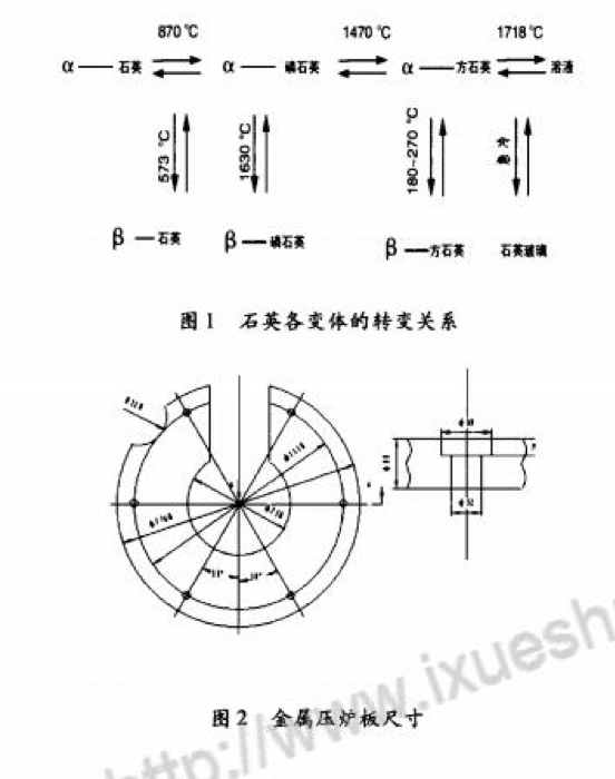 目前國內中頻爐用于熔煉鑄鐵的普通爐襯材料使用的是SiO:石英砂。自然界的石英是低溫型的。開始加熱時,石英砂隨溫度升高而均勻膨脹。在573~C時發生同質異晶轉變,低溫石英轉變成高溫目前國內中頻電爐用于熔煉鑄鐵的普通爐襯材料使用的是SiO:石英砂。石英后因晶體轉變而突然膨脹(這個轉變是可逆的)。高溫石英砂在870~C以上和有溶劑存在的條件下會轉變成磷石英,但轉變速度很慢。升高溫度可加快轉變,但即使在1250—1350℃高溫下亦需1小時左右才能完成。此時體積增大1.6倍,磷石英在1470℃以上變成方石英。方石英在1713℃以上融化,冷卻后變成石英玻璃,如圖1所示。