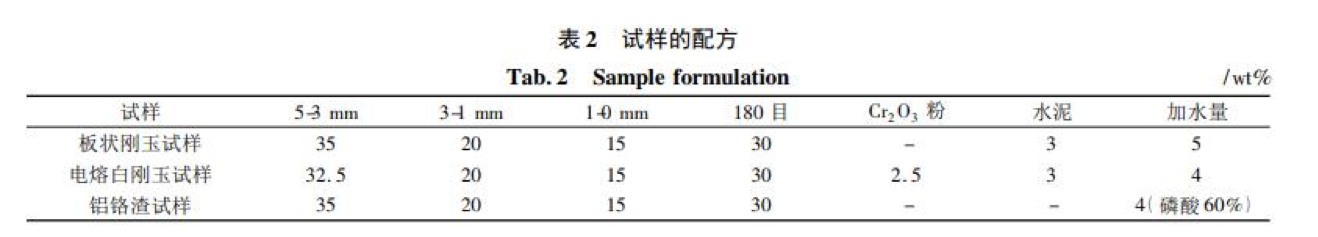 實驗用主要原料有板狀剛玉( 5 ~ 3 mm、3 ~ 1 mm、1 ~ 0 mm 和≤0. 088 mm) 、電熔白剛玉( 5 ~ 3 mm、3 ~ 1 mm、1 ~ 0 mm 和≤ 0. 088 mm) 、鋁鉻渣( 5 ~ 3 mm 、3 ~ 1 mm、1 ~ 0 mm 和≤ 0. 088 mm) 、純鋁酸鈣水泥( Secar 71) 、磷酸溶液( 濃度 60% ) 和工業鉻綠。板狀剛玉體積密度 5. 53 ~ 5. 57 g·cm - 3,吸水率為 1. 0% ~ 1. 09% ,顯氣孔率約 4. 1% ~ 4. 8% ; 電熔白剛玉體積密度 3. 54 ~ 3. 70 g·cm - 3,吸水率為 2. 43% ~ 2. 58% , 顆粒料的顯氣孔率約 6. 1% ~ 7. 4% ; 鋁鉻渣顆粒體積密度為3. 29 ~ 3. 37 g·cm - 3,吸水率為 4. 2% ~ 4. 6% , 顯氣孔率 10. 3% ~ 12. 1% 。原料的化學組成見表 1。