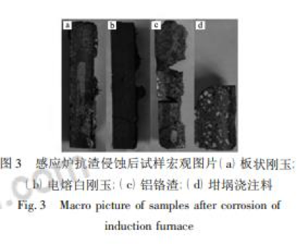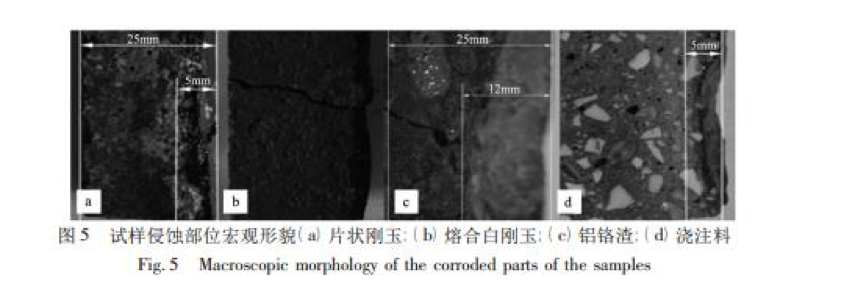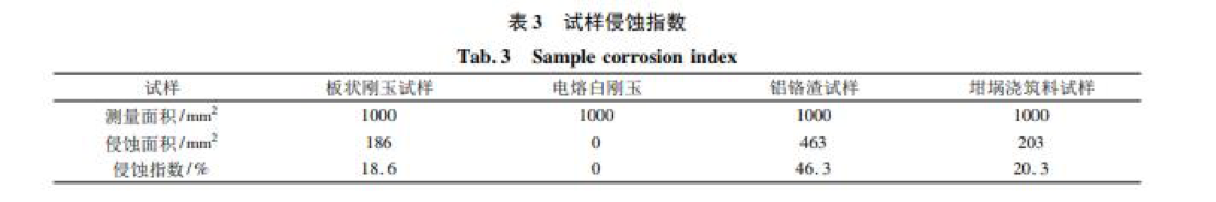 對上述四種中頻爐內襯試樣侵蝕部位進行觀察如圖 5 所示。試樣寬度均為 25 mm,板狀剛玉試樣被侵蝕約 5 mm, 電熔白剛玉試樣未觀察到宏觀侵蝕,鋁鉻渣試樣被侵蝕約 12 mm,坩堝澆注料試樣被侵蝕約 5 mm,按公式 ( 1) 計算試樣侵蝕指數如表 3 所示。 侵蝕指數 R = 侵蝕面積 測量面積 × 100%