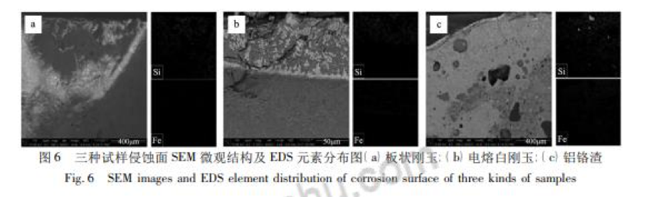 從圖 6b 中可以看出,試樣抗熔渣侵蝕和滲透能力均較強。當中頻爐熔渣與試樣接觸時,在工作層表面形成了 一個明顯的邊界層,這是由于基質中含有一定量的 Cr2O3,一方面 Cr2O3 與剛玉骨料形成固溶體,鋁鉻固溶體 的存在可阻止熔渣向內部的侵蝕滲透,顯著提高其抗 SiO2-FeO 渣侵蝕性能。另一方面渣中的 FeO 和 SiO2 與 Al2O3 和 Cr2O3 成分反應生成鐵鉻、鐵鋁尖晶石、莫來石等高熔點化合物,生成的高熔點化合物填充于基 質和氣孔從而提高了材料的致密性度并且能有效的抵抗爐渣的侵蝕。圖 6c 為鋁鉻渣經爐渣侵蝕后的 SEM 和 EDS 圖片,由于試樣氣孔率較高,且骨料雜質含量高,導致高溫燒成時液相量和基質遷移所造成的空隙增加。 高溫下,中頻爐熔融的爐渣和液相沿著氣孔、裂紋和空隙滲入材料內部導致爐渣對試樣的侵蝕深度的急劇增加。