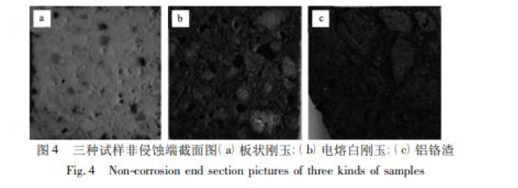 中頻爐動態抗渣實驗后三種試樣和坩堝澆注料試 樣的宏觀圖片如圖 3 所示。坩堝澆注料是以板狀剛玉 和活性氧 化 鋁 為 骨 料、鉻 綠 為 細 粉、純 鋁 酸 鈣 水 泥 ( secar 71) 為結合劑制備的。在切割分離坩堝中鑲嵌的試樣的過程中,由于切割機的震動對試樣產生剪切應力,導致試樣斷裂,試樣斷裂的程度與試樣的強度成正相關。在切割過程中板狀剛玉試樣未斷裂,僅在侵蝕處出現裂紋,并且圖 4 中板狀剛玉試樣的截面圖反映試樣基質和骨料燒結良好,結構致密。電熔白剛玉試樣與板狀剛玉試樣相比裂紋較大,但是整體結構完整,其截面圖較板狀剛玉試樣基質部分出現較多的大氣孔,可能是由于物料的級配和搗打工藝導致; 鋁鉻渣試樣基本已經破碎,從破碎的斷口處可以看出,試樣內部的基質處和骨料均具有較多的小氣孔,樣品結合性較弱,強度較低,導致切割過程中損毀嚴重。