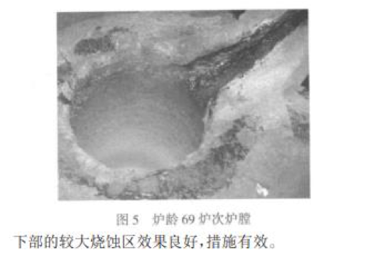 本次試驗爐齡 79 爐次達到了預期壽命,說明試 驗方案合理,試驗成功。從試驗過程中觀察到:中期 燒結有效地減緩了爐襯的損耗速度,措施有效;兩次 中修均達到了預期目的,使用短坩鍋中修應對爐膛下部的較大燒蝕區效果良好,措施有效。