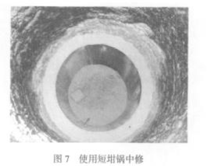 2009 年 4 月進行了第二次試驗。在整個中頻爐開爐過 程中,有過 5 次較長時間的停爐,中頻爐爐膛未出現大裂 紋。在爐齡 25 爐次時,進行第二次燒結,燒結工藝是 在燒結溫度保溫 2h。在爐齡 42 爐次時,在爐襯中下 部出現較大的燒蝕區,進行第一次中修,中修工藝是 使用短坩鍋和爐襯材料修筑爐膛底部,經過短暫燒 結后正常開爐(圖 4)。在爐齡 69 爐次時,爐膛情況正 常(圖 5),使用短坩鍋進行第二次中修。在爐齡 79 爐 次時,因中頻爐設備原因停止試驗,爐膛良好。